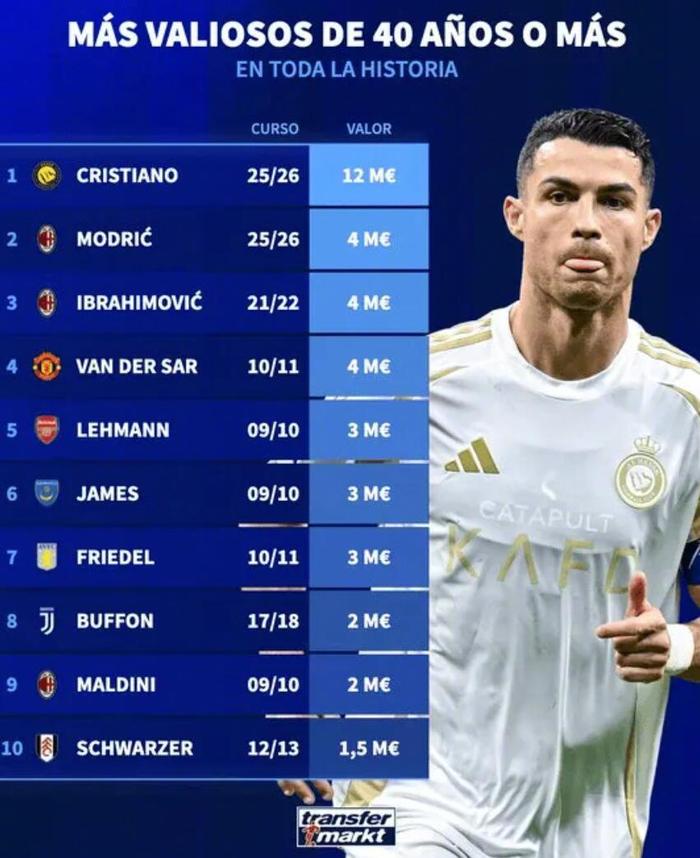 德转网站整理了一份历史上40岁及以上职业球员的身价排行,本赛季C罗以1200万欧元高居榜首,AC米兰三人上榜。
